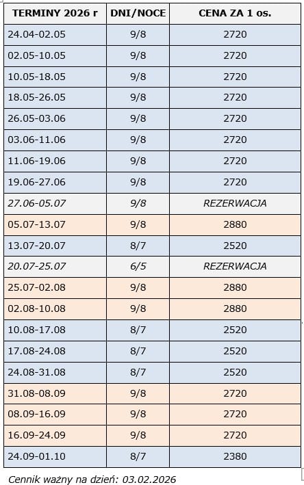 Turnus 9 dniowy to: 8 noclegów, kolacji i śniadań i 7 obiadów (istnieje możliwość wykupienia obiadu w dniu wyjazdu)